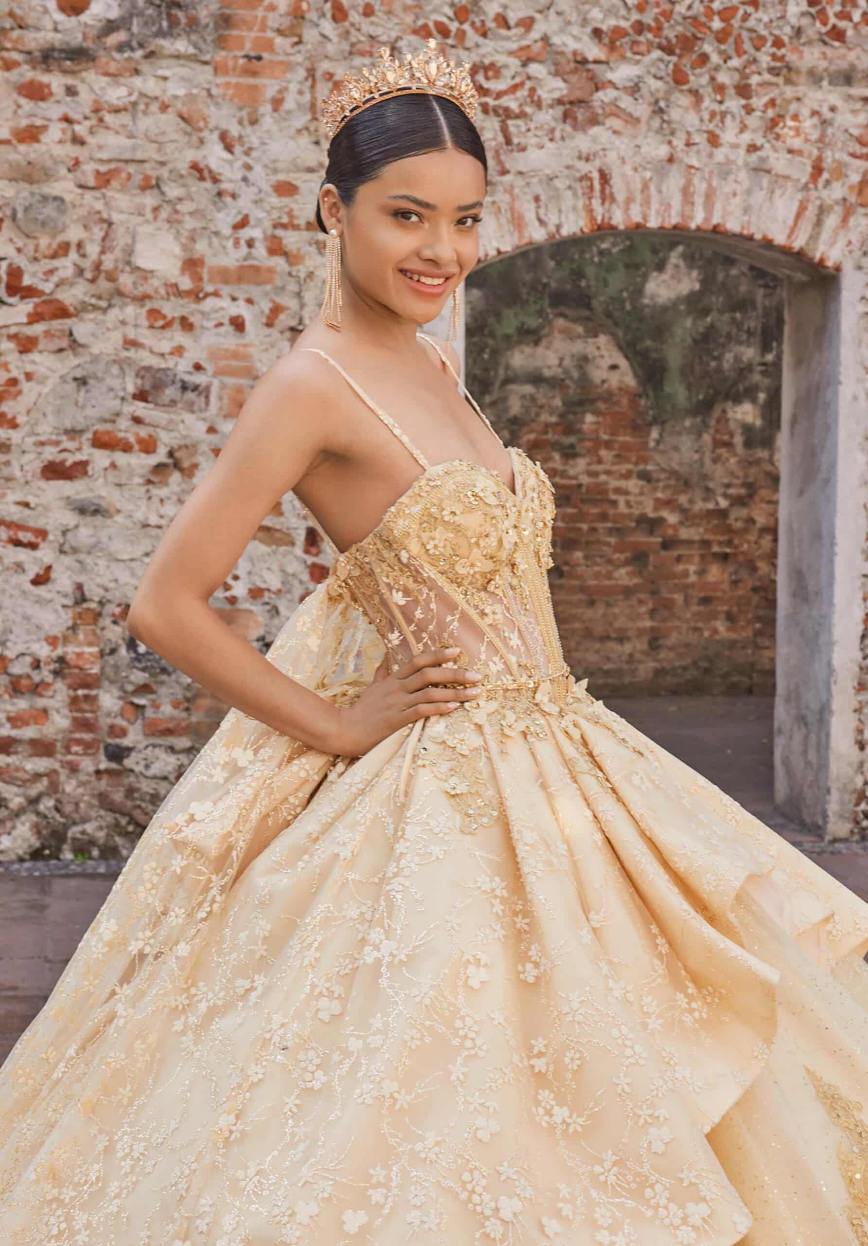 Glitter tulle ball gown has a strapless sweetheart neckline with crystal boning, a floral glitter peplum, and a detachable watteau back.