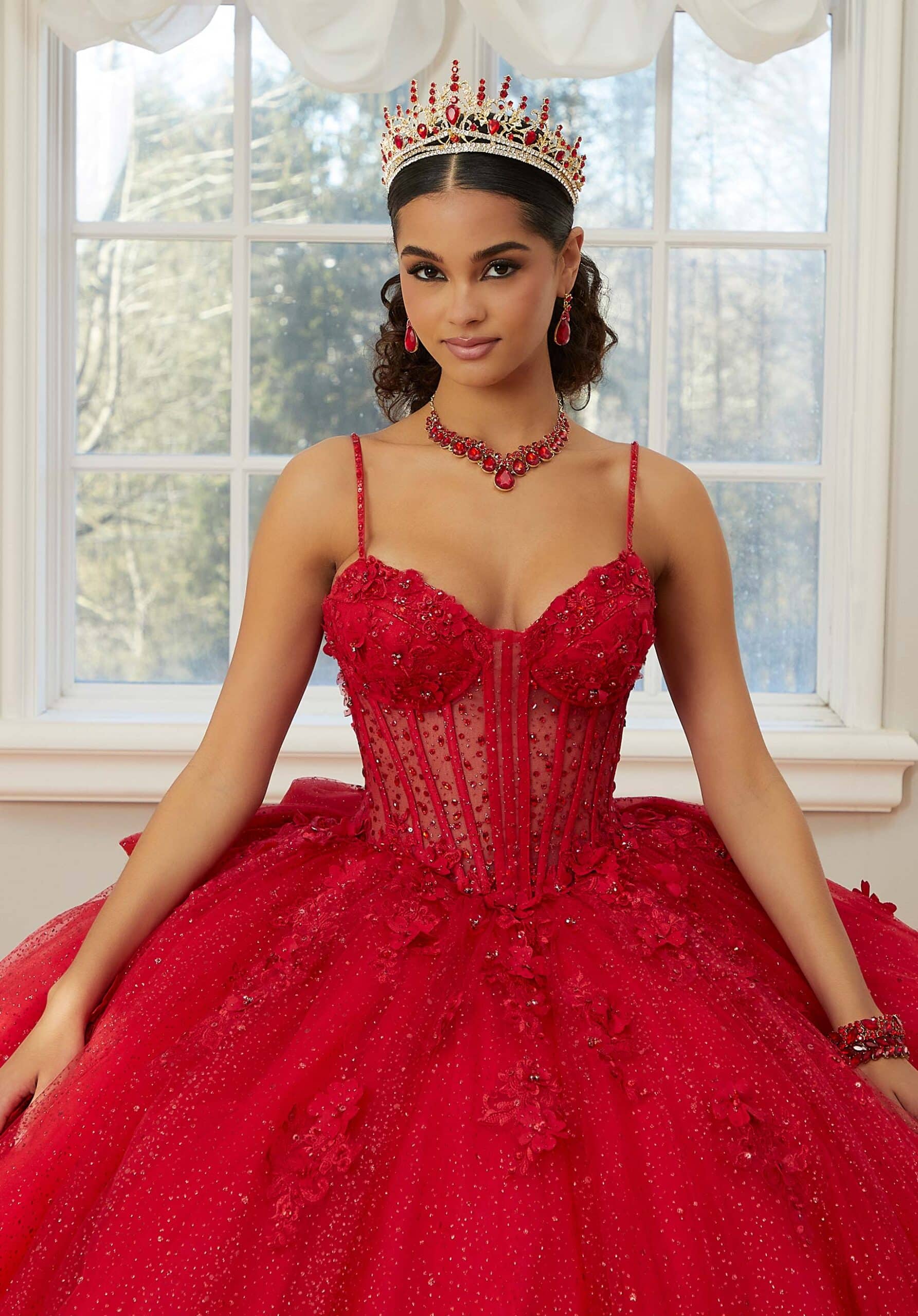 Quinceañera ball gown features a sheer bodice with glam crystal beading and three-dimensional floral lace appliqués that cascade down the sparkle tulle dress. Corset boning has a couture feel, while the detachable back bow is a feminine touch. Matching bolero jacket included.