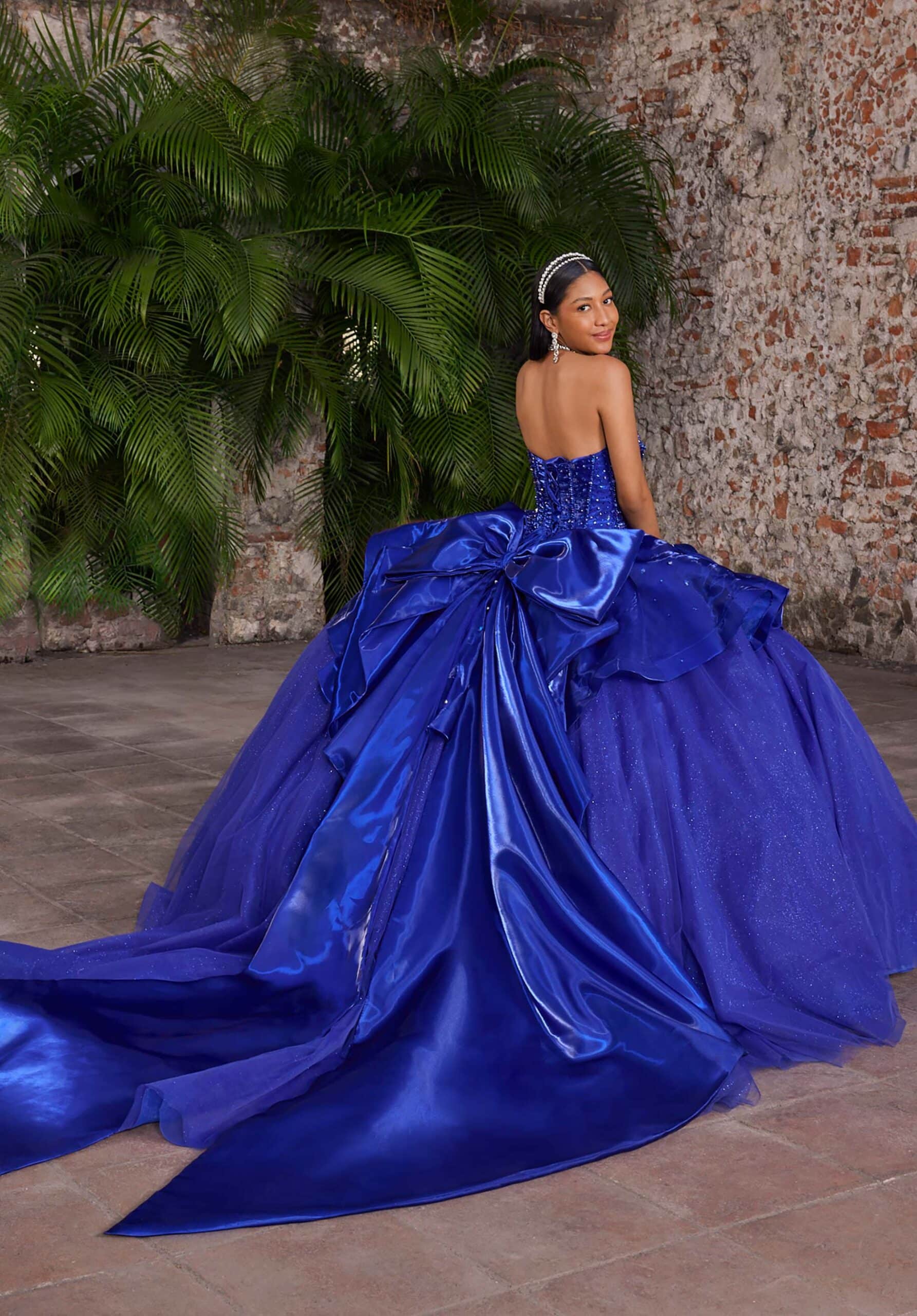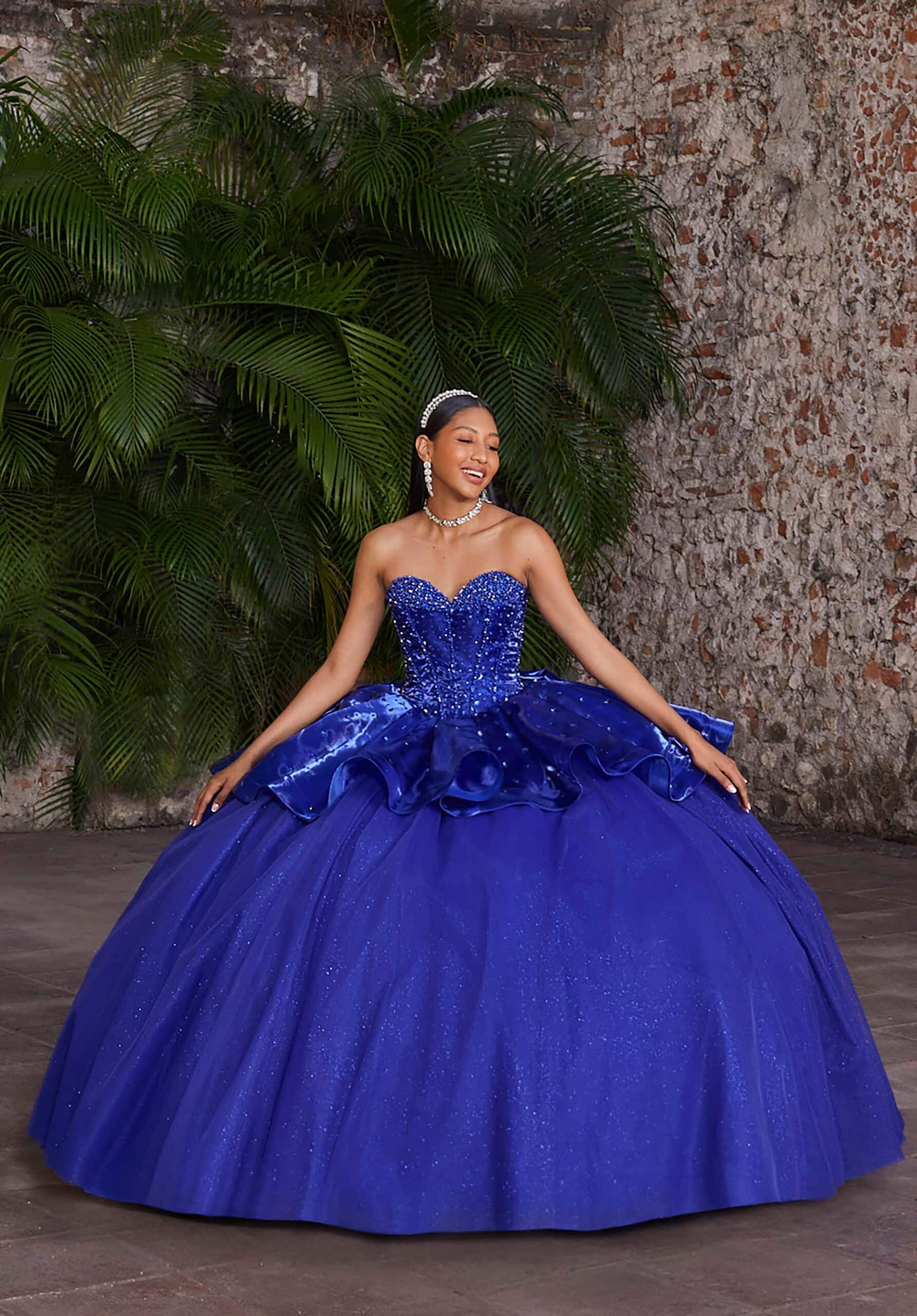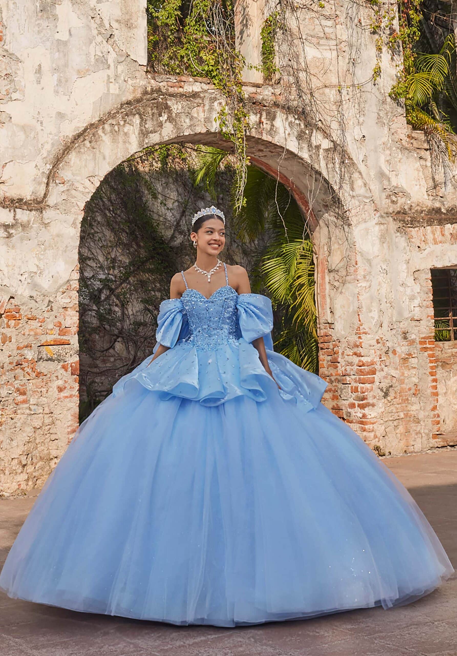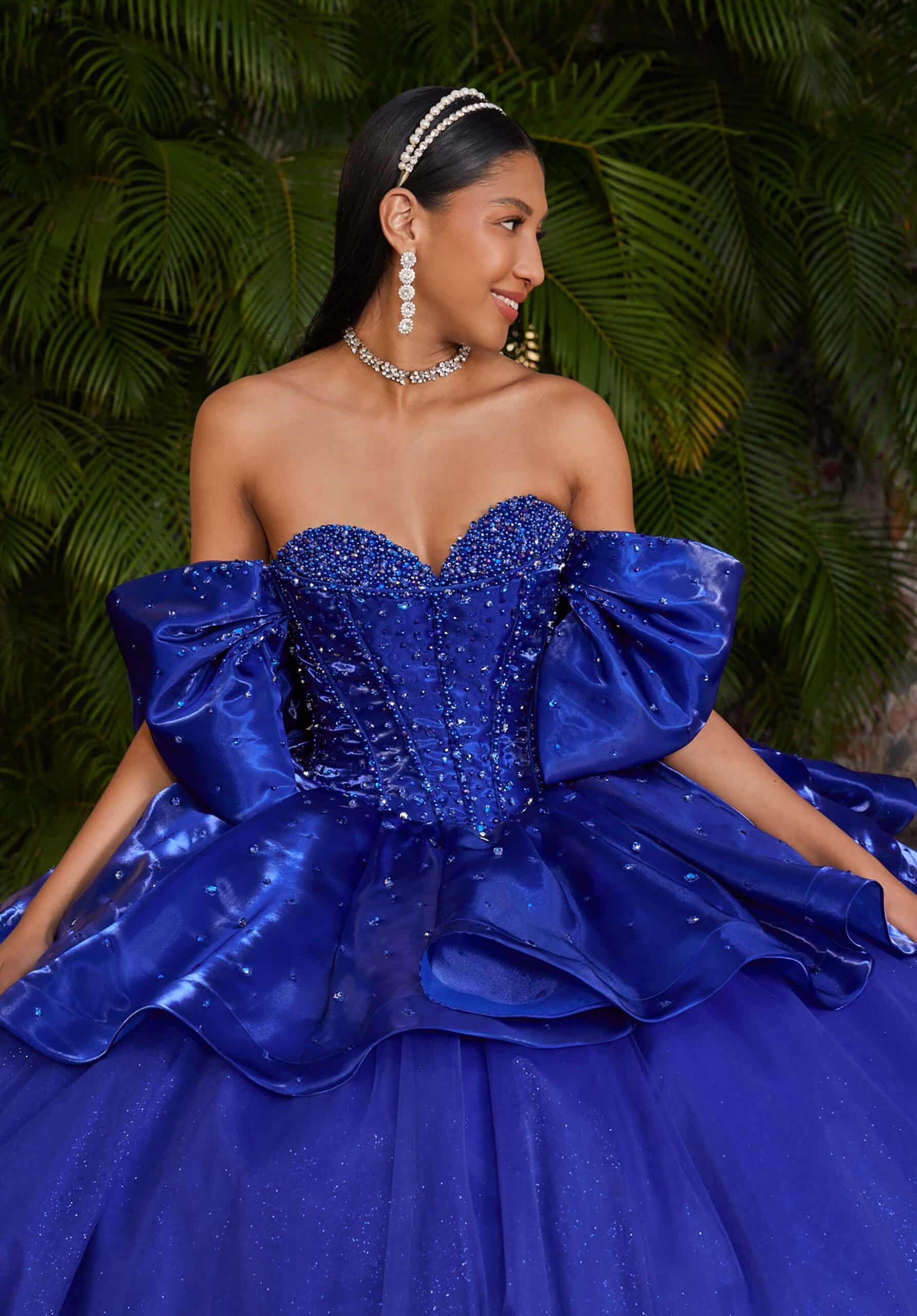 Organza ball gown has a sweetheart neckline with a crystal scoop bodice and ruffle tiered overskirt with detachable puff sleeves and bow.