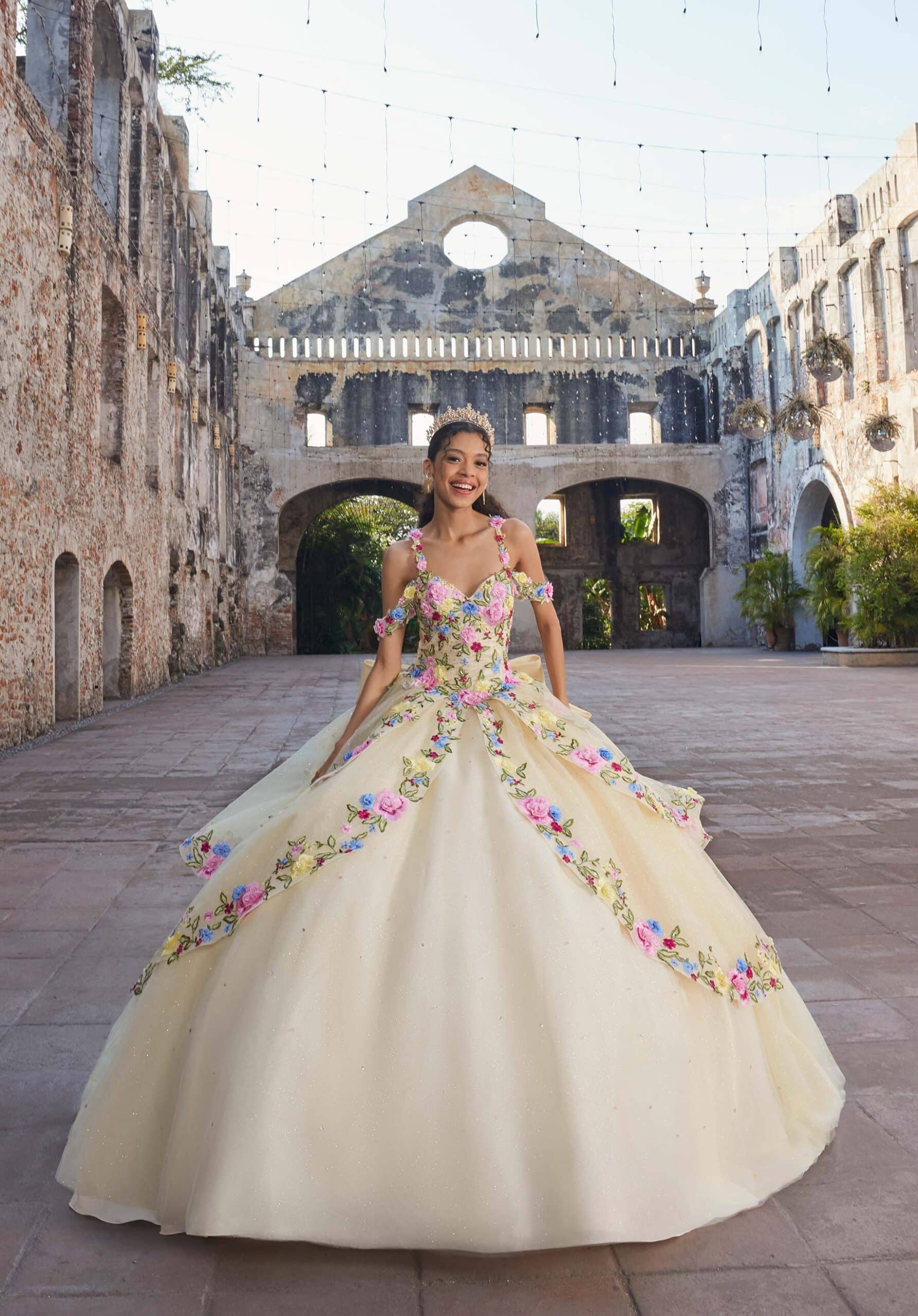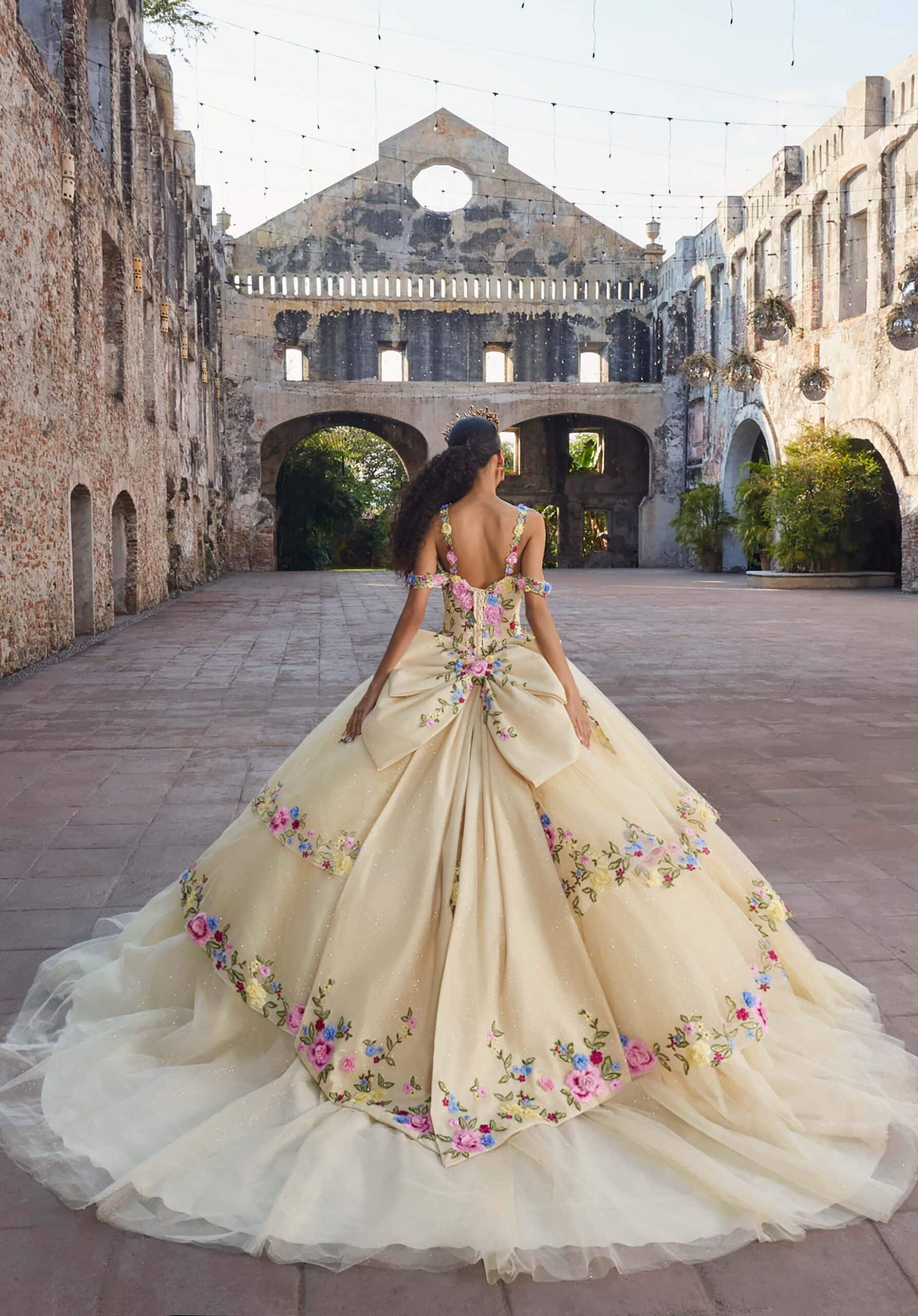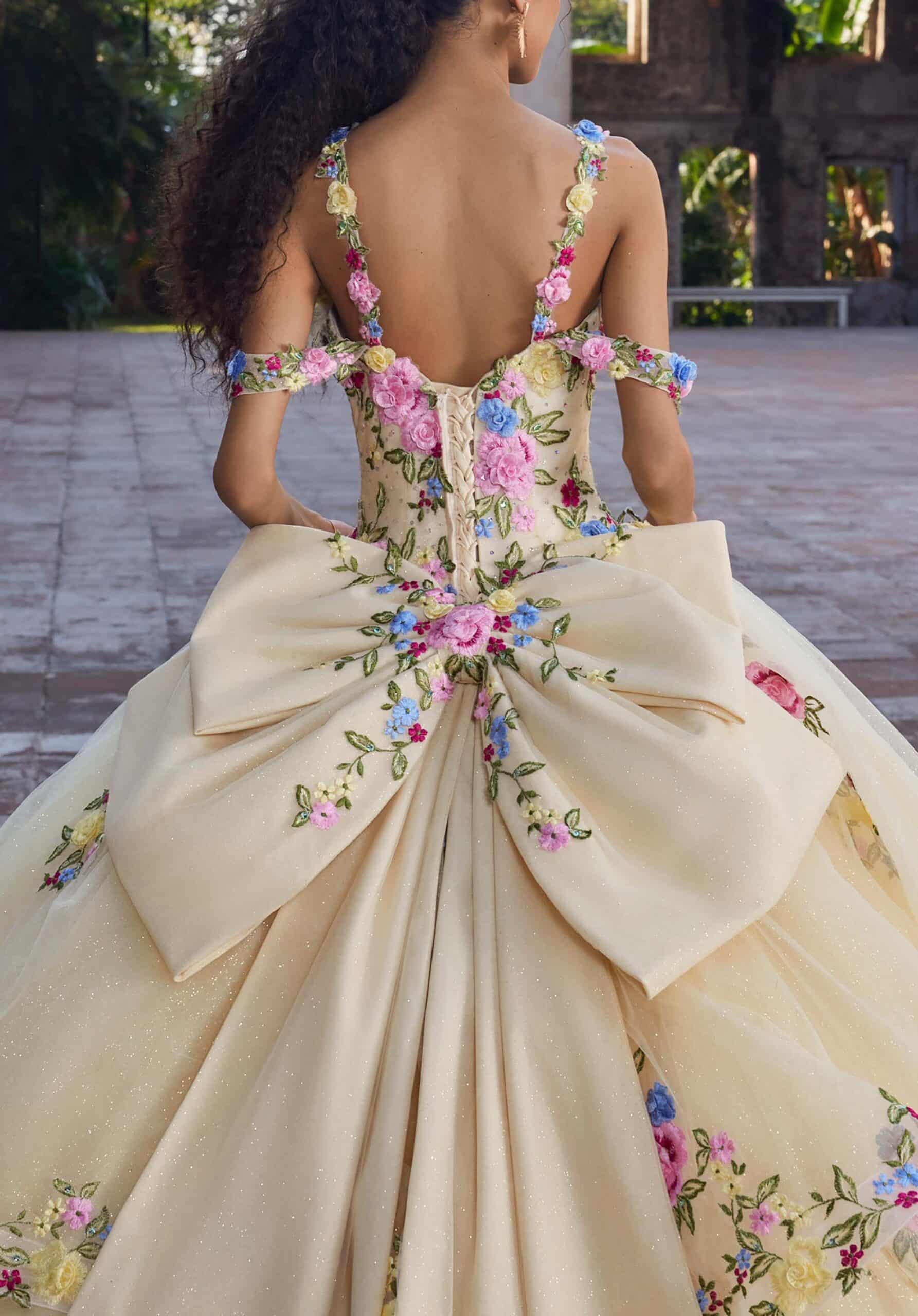 Tulle ball gown has a sweetheart bodice with floral embroidery and peplum skirt with detachable off-the-shoulder straps and bows.