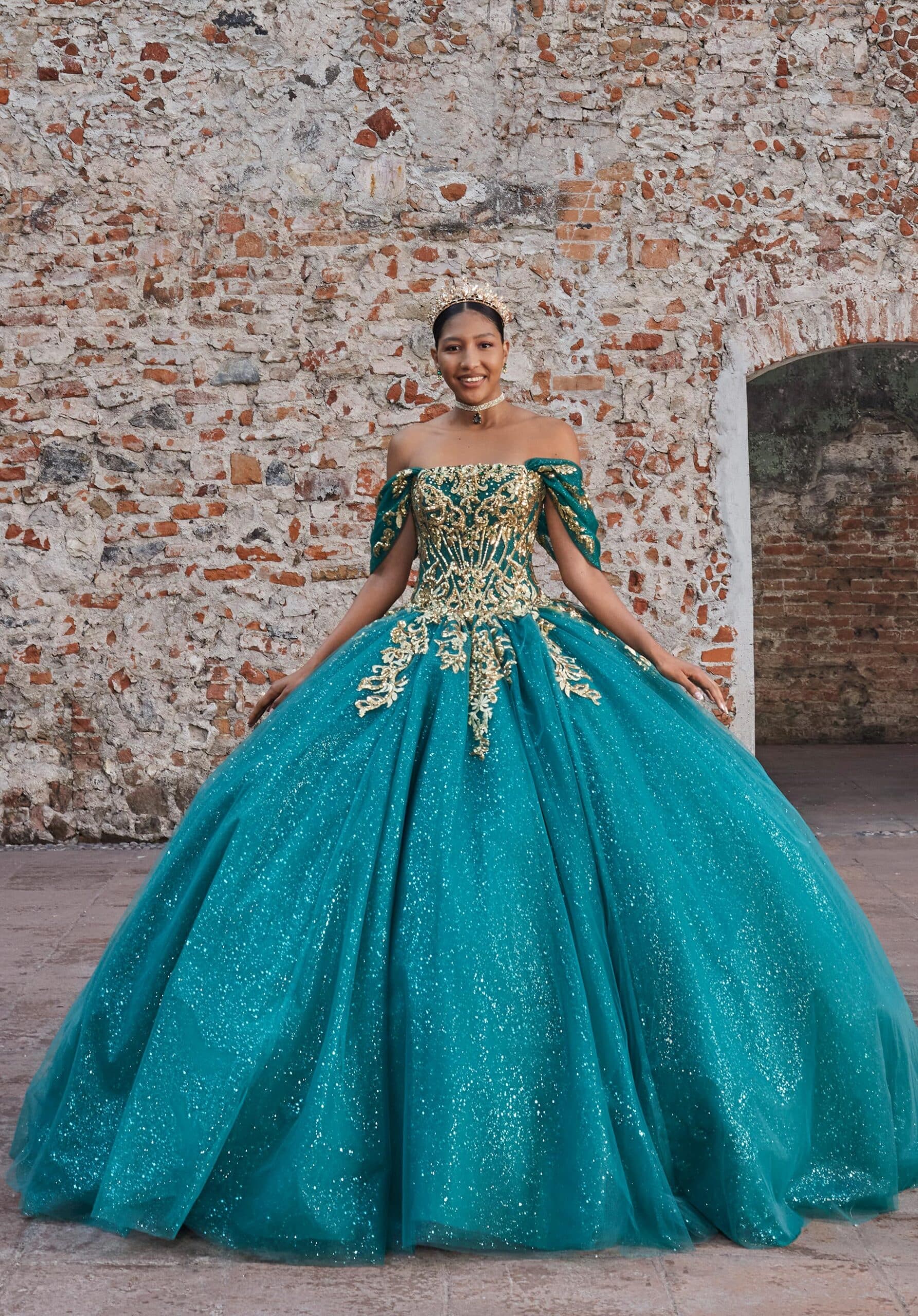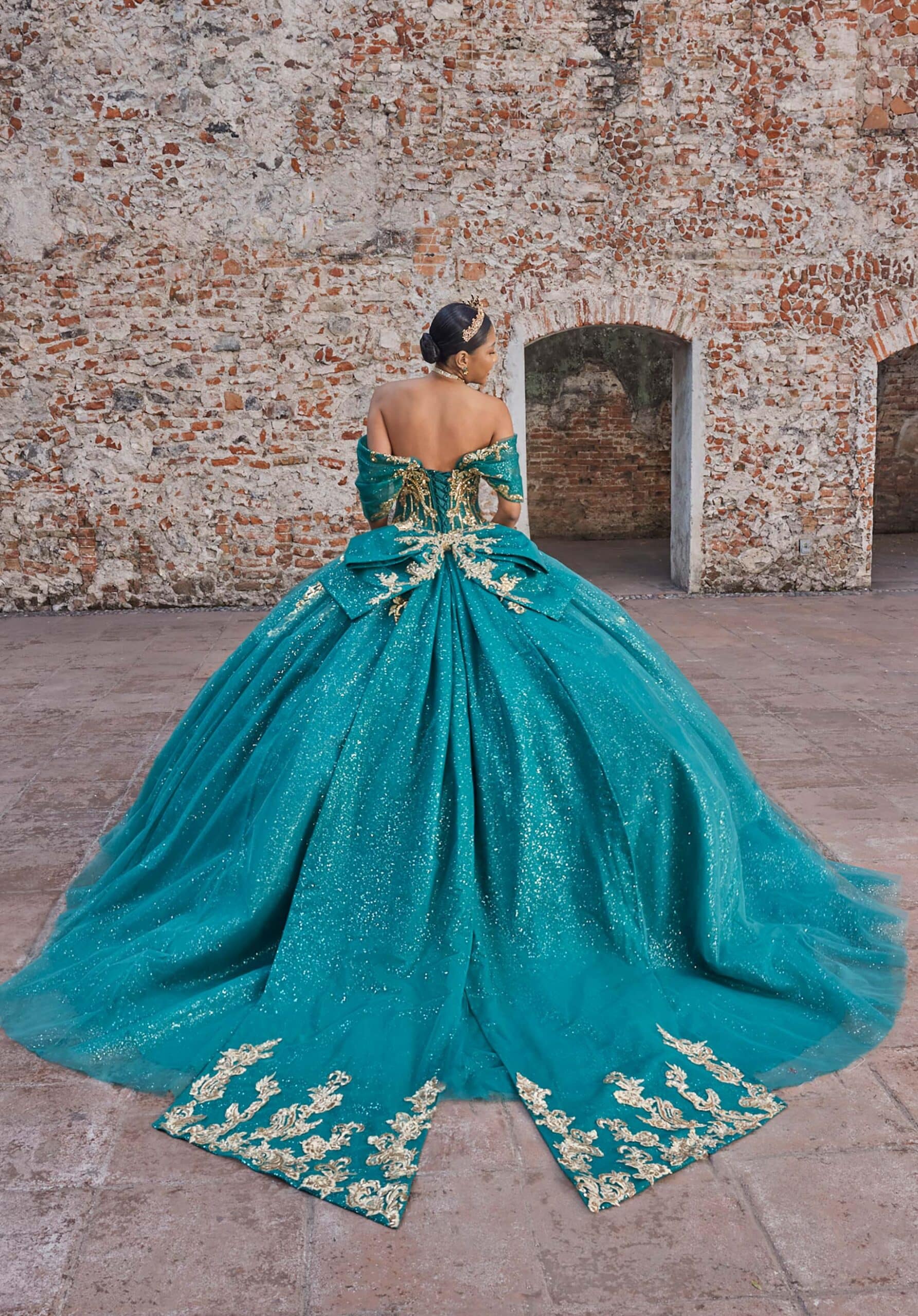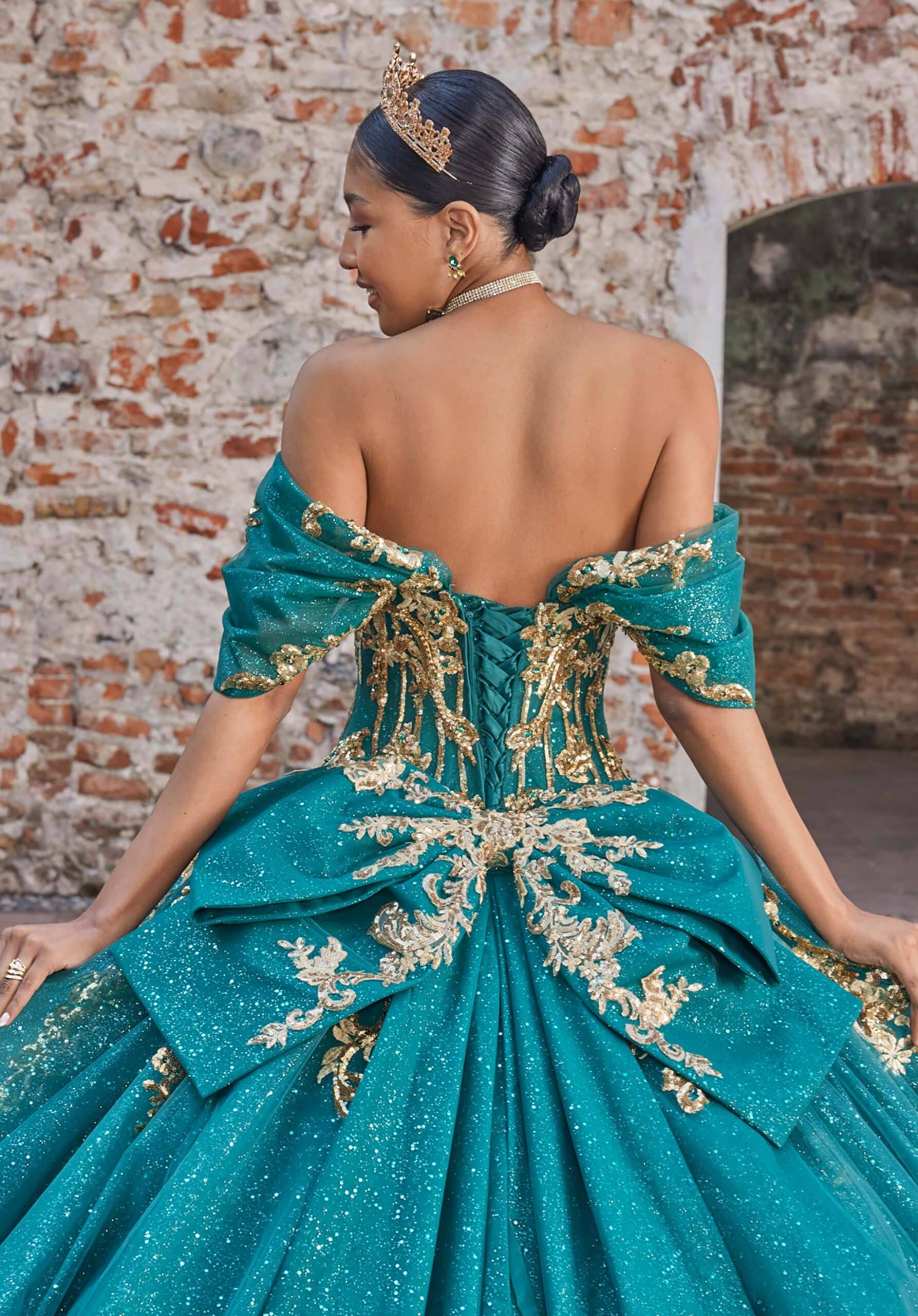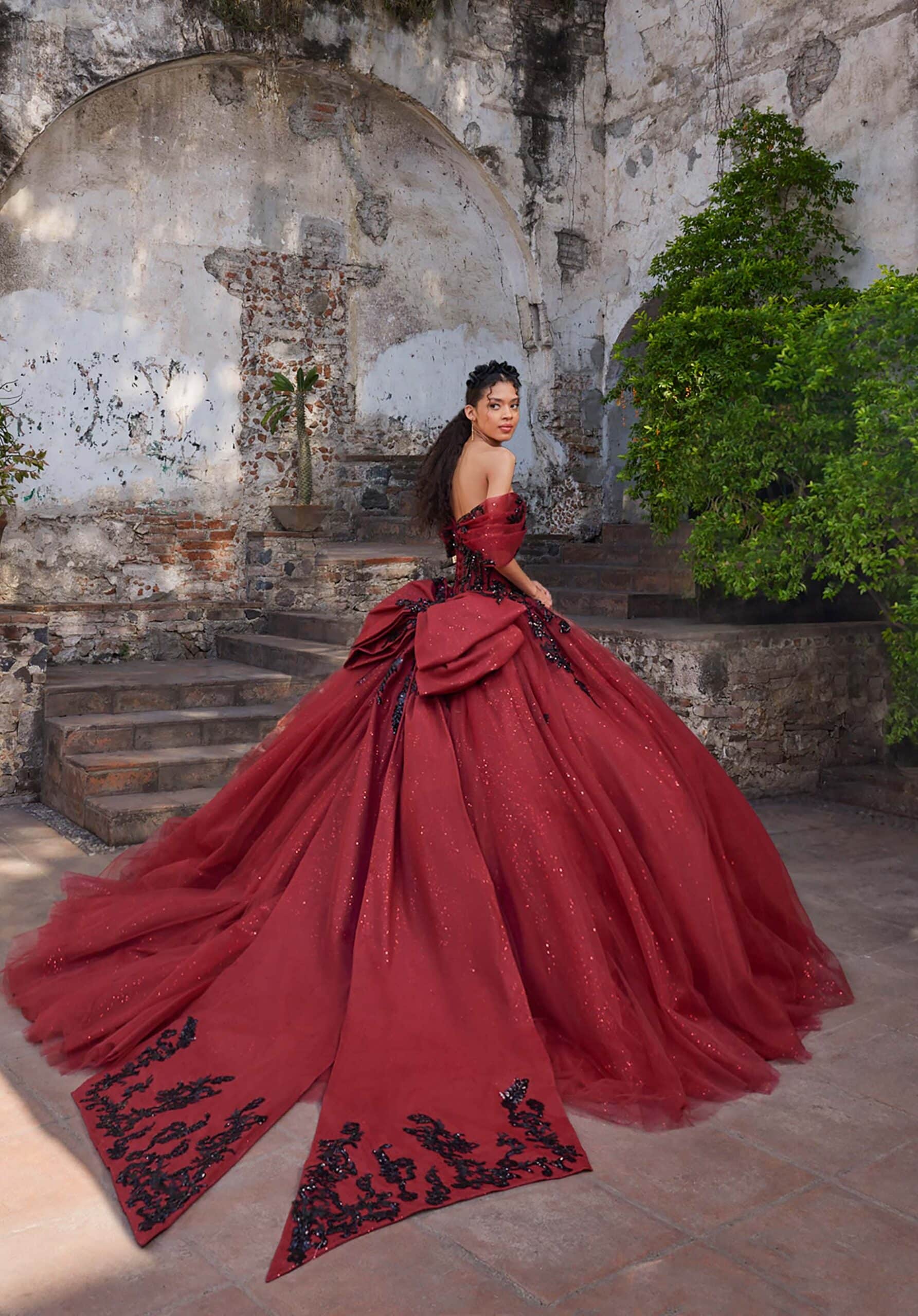 Strapless ball gown on a corset bodice with metallic beaded lace appliqués, detachable off-the-sleeves, and back bow in glitter tulle.