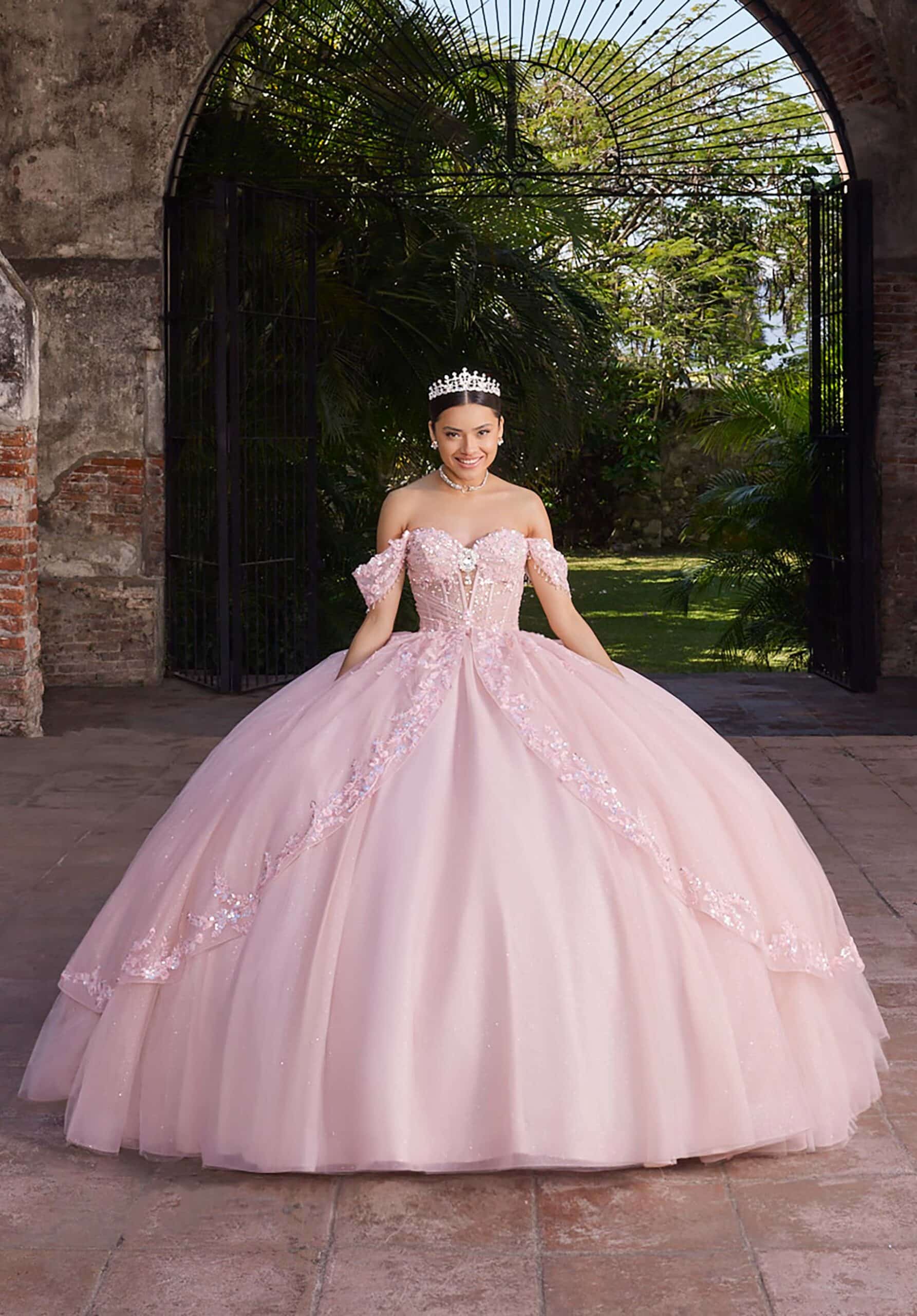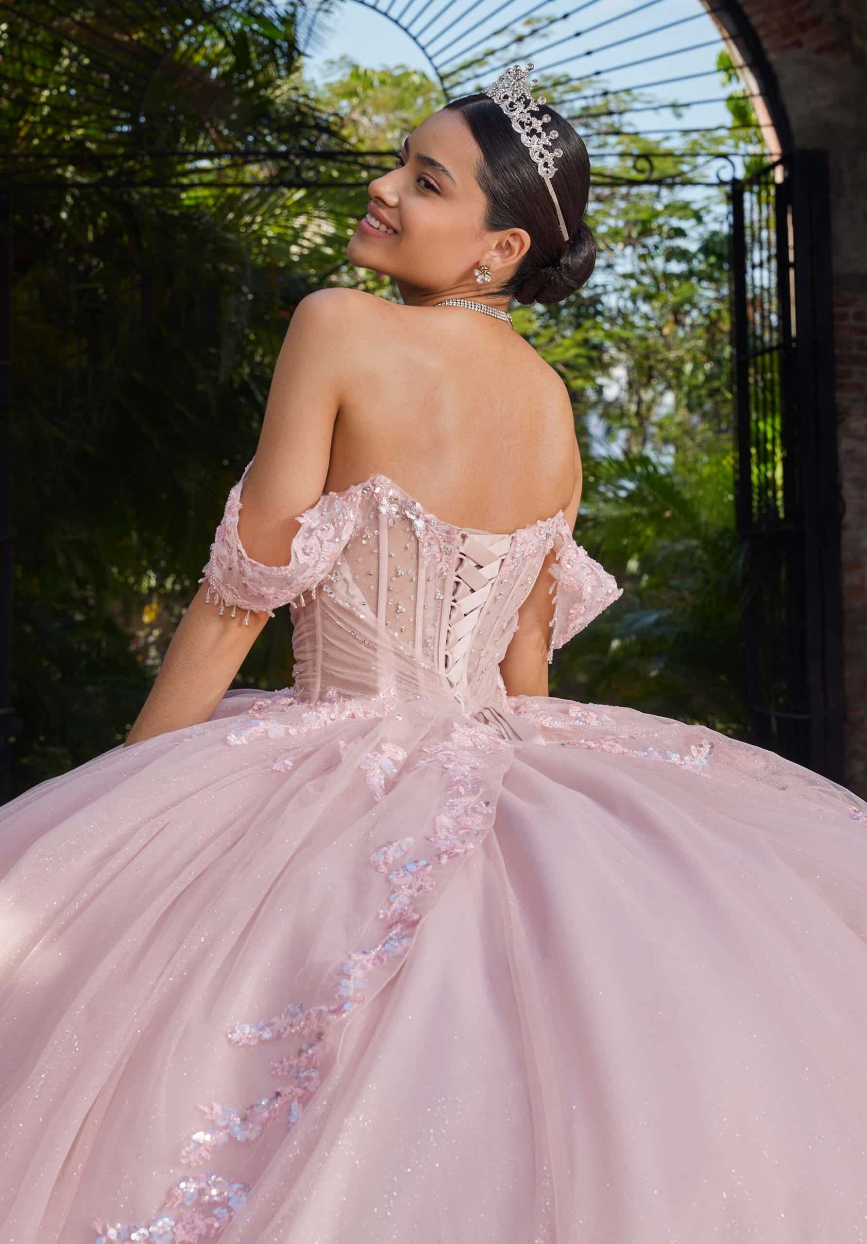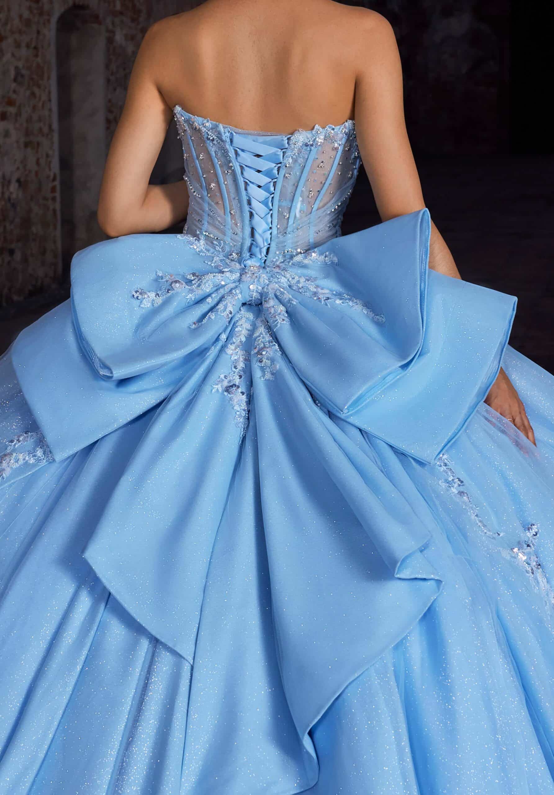 Sweetheart ball gown has a sheer midriff with a floral appliqué peplum skirt, detachable off-the-shoulder sleeves and bow in glitter tulle.