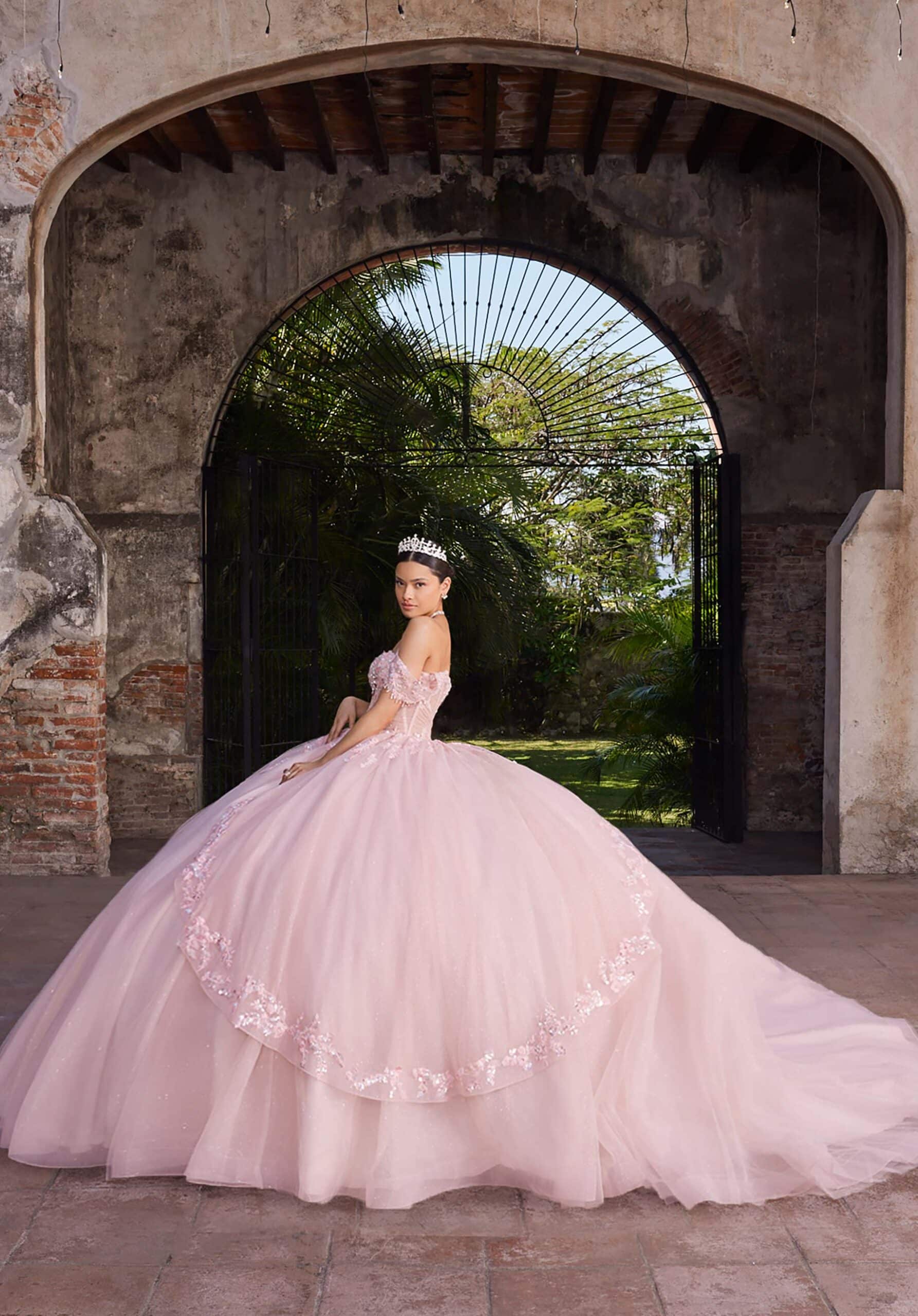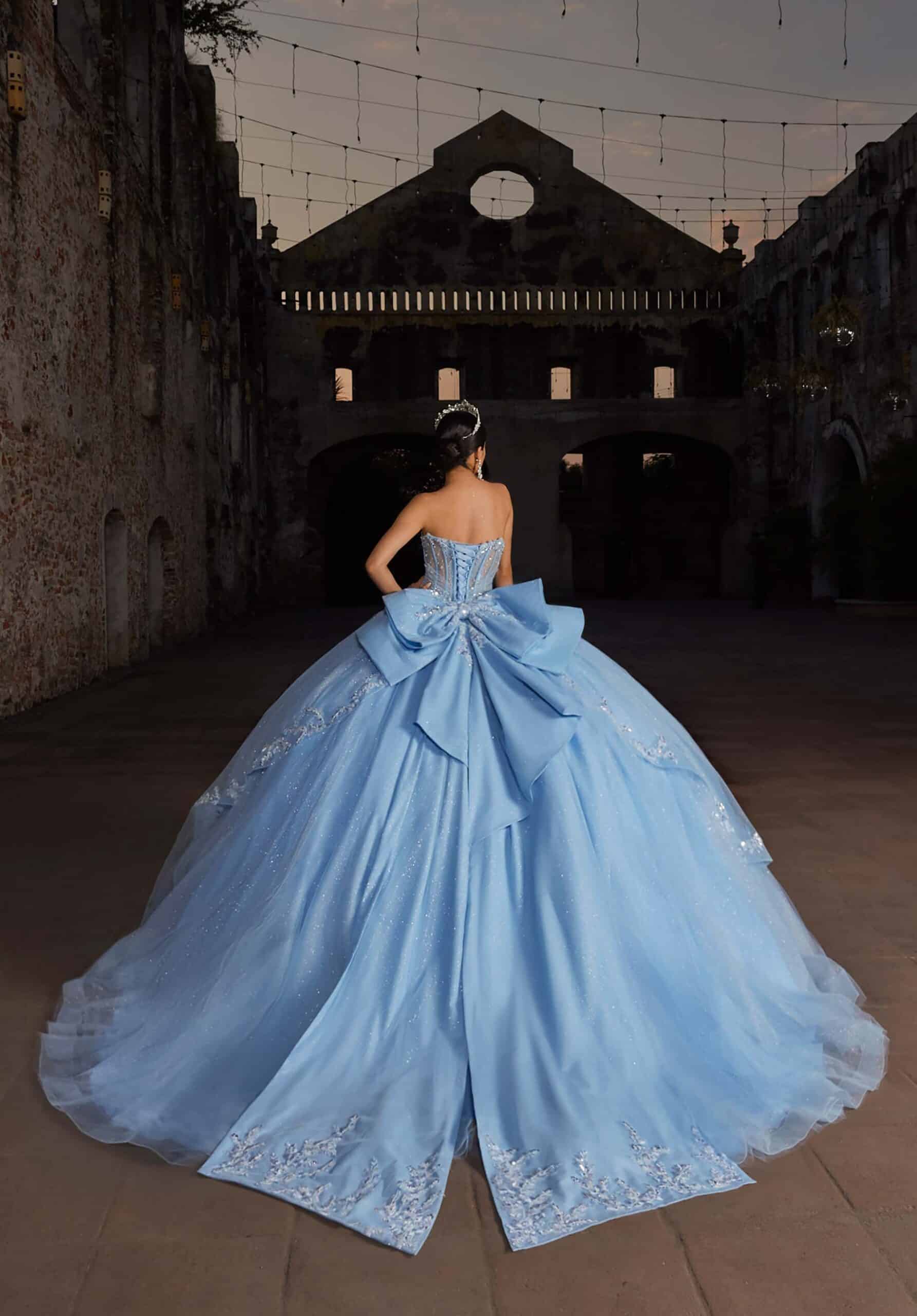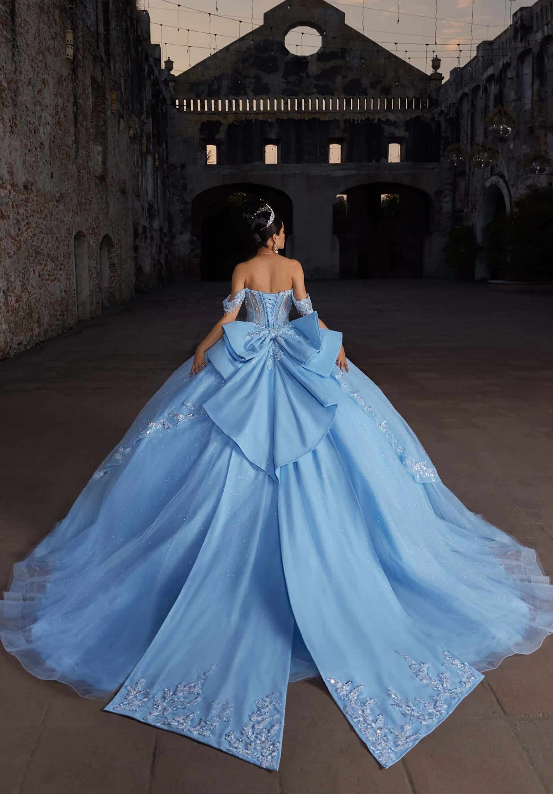 Sweetheart ball gown has a sheer midriff with a floral appliqué peplum skirt, detachable off-the-shoulder sleeves and bow in glitter tulle.